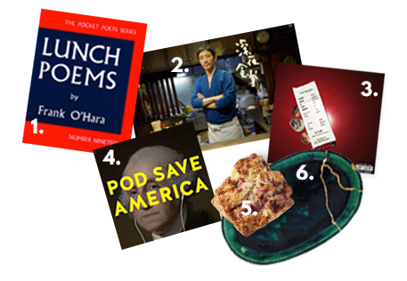 Reads: Lunch Poems by Frank O’Hara. Great, snackable poems about people-watching in Manhattan at noon. And they all fit perfectly in a pocket-sized paperback. Here’s a taste from one of my dog-eared pages, “On the Way to San Remo”: